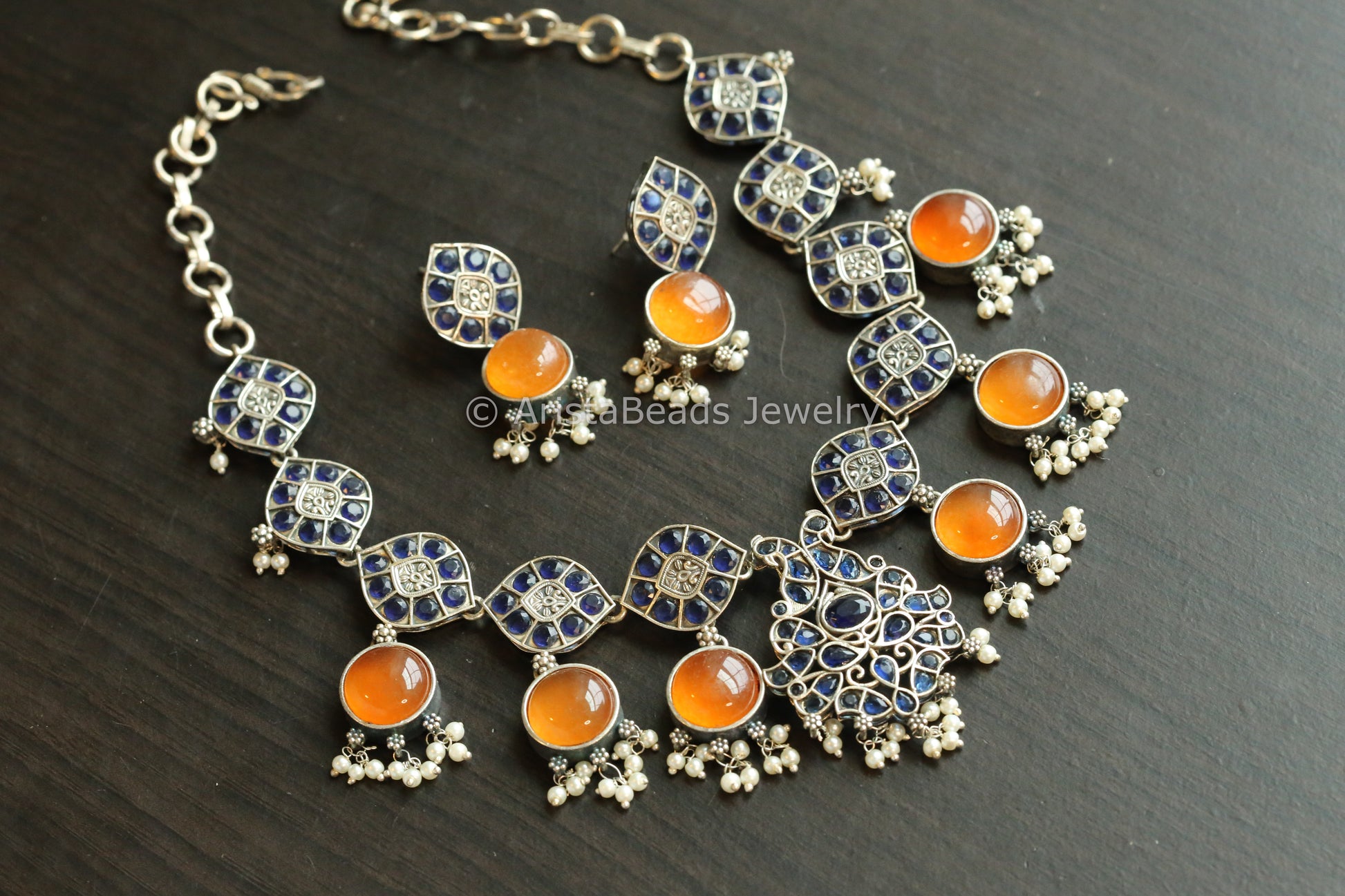 Monalisa & CZ Oxidized Necklace Set - Orange Blue
