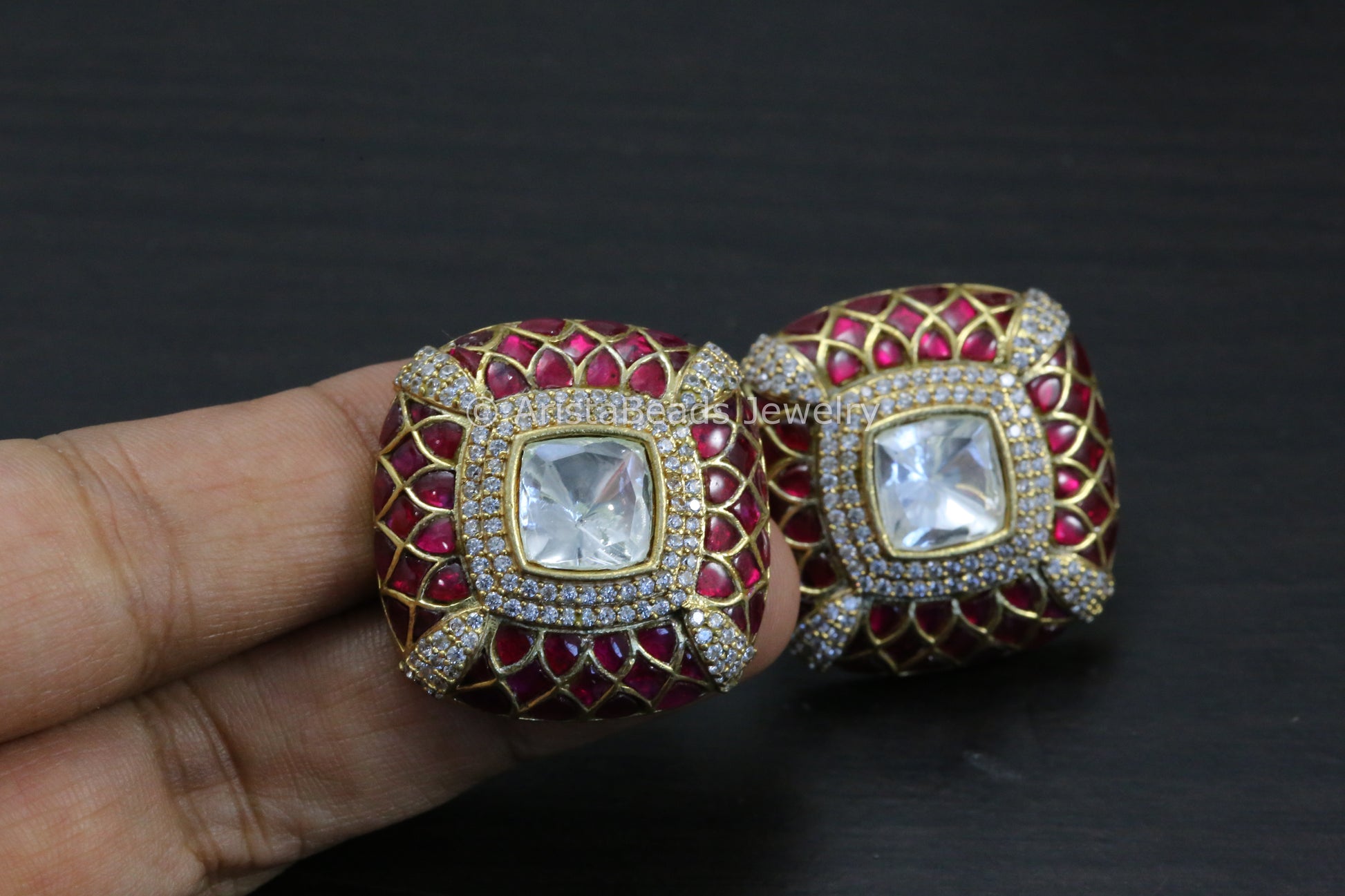 Next To Real Large Moissanite Polki & Jadau Stone Studs - Ruby