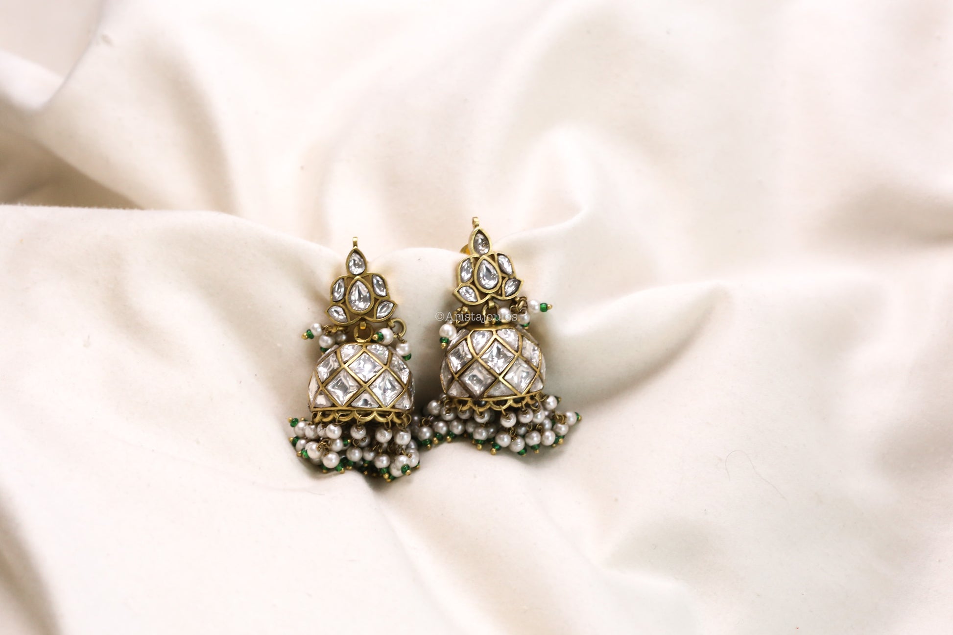 Experience the allure of the Nyra Vintage Polish Jhumka in ruby, a jewelry piece that beautifully bridges tradition and today's fashion. Each earring showcases intricate oval dome detailing adorned with lustrous antique pearls, creating a look that's both distinctive and deeply meaningful. Perfect for anyone who values jewelry with soul and substance, these Jhumkas bring an air of sophistication to every moment, celebrating cultural heritage while feeling completely current and wearable.