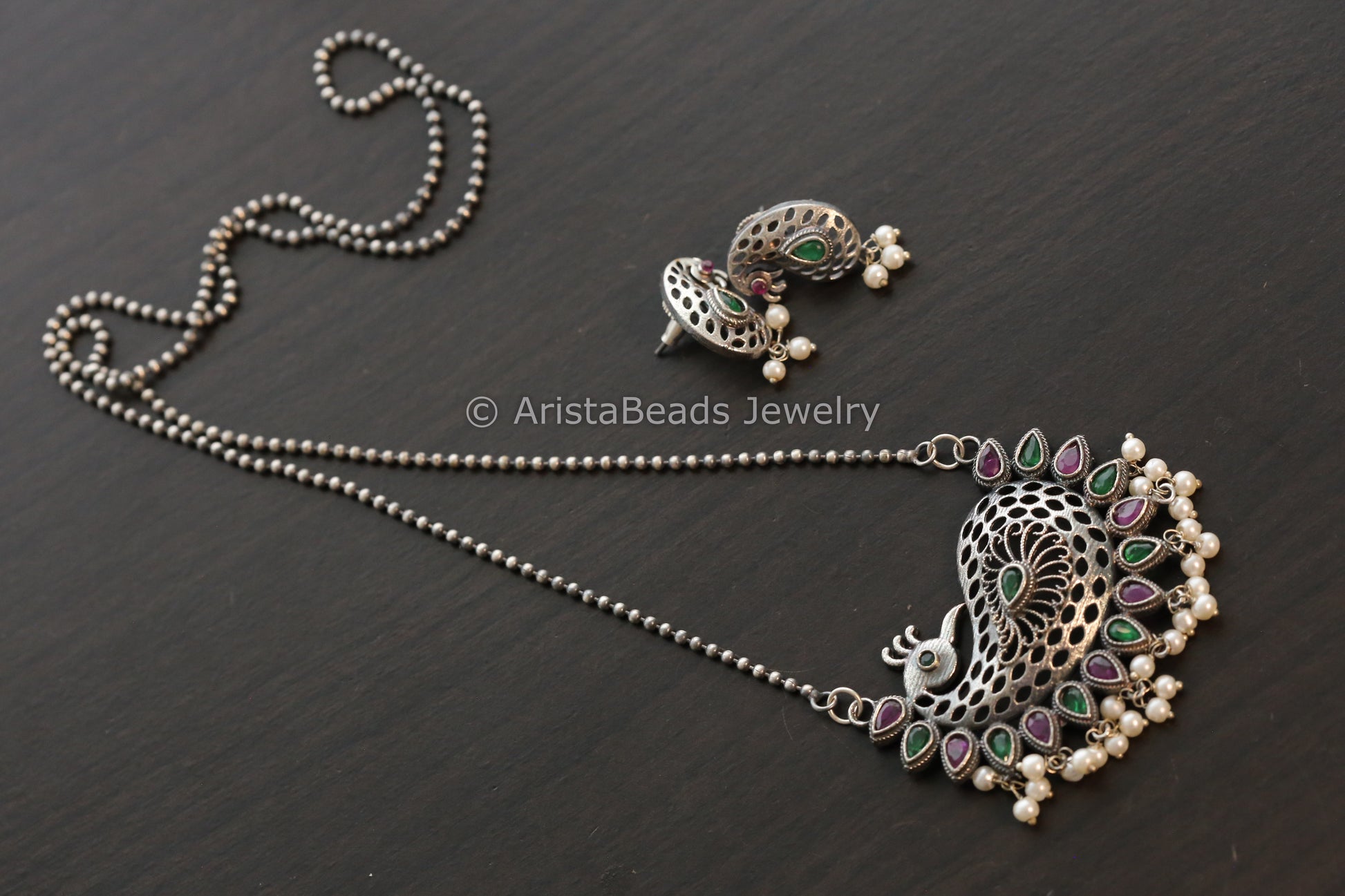 Oxidized Peacock Necklace Set - Red Green