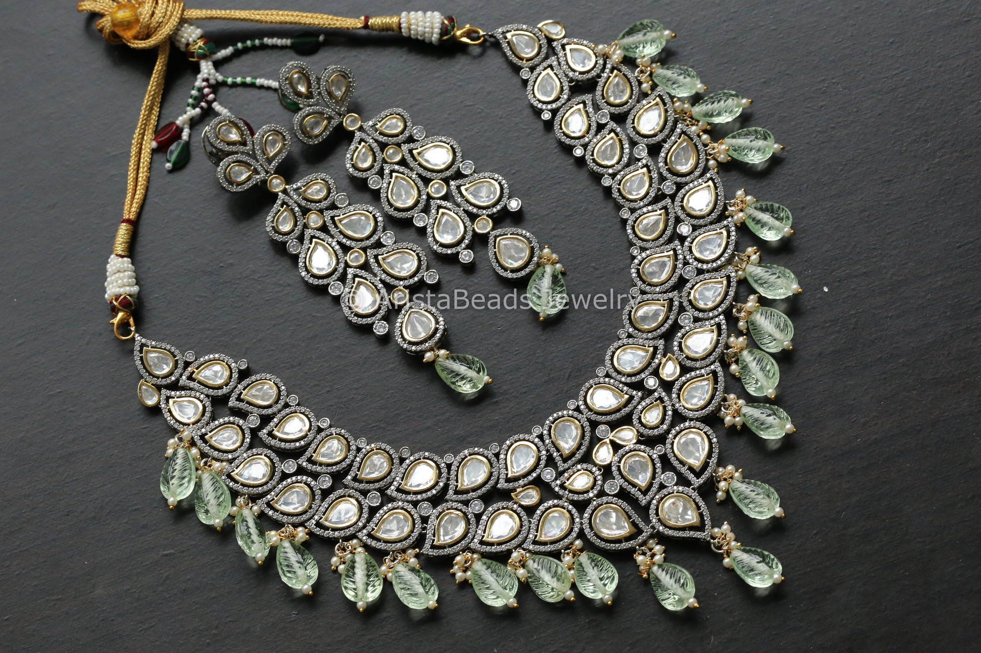Dual Tone Polki & Micro CZ Necklace Set - Mint