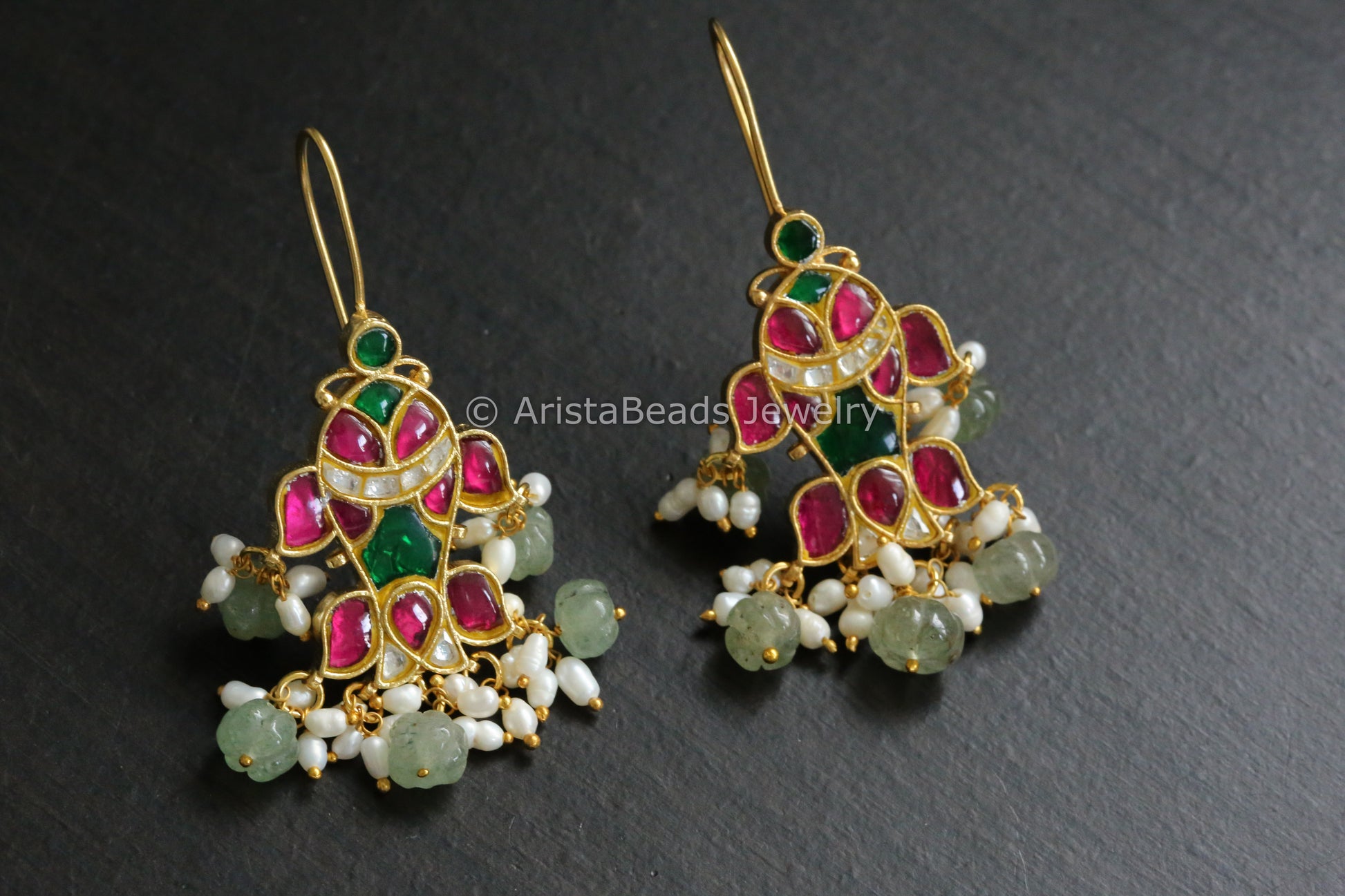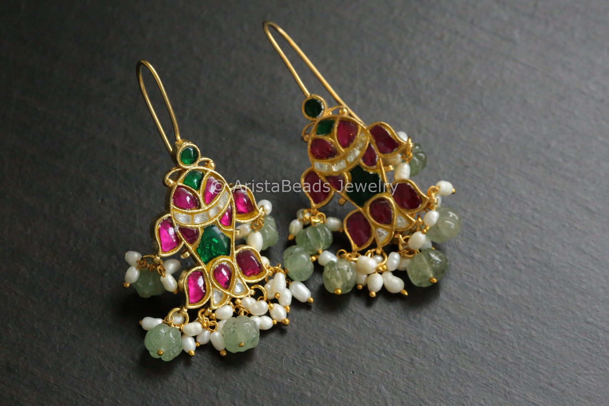 Silver Look Alike Kundan Earrings With Rice Pearls - Green Ruby