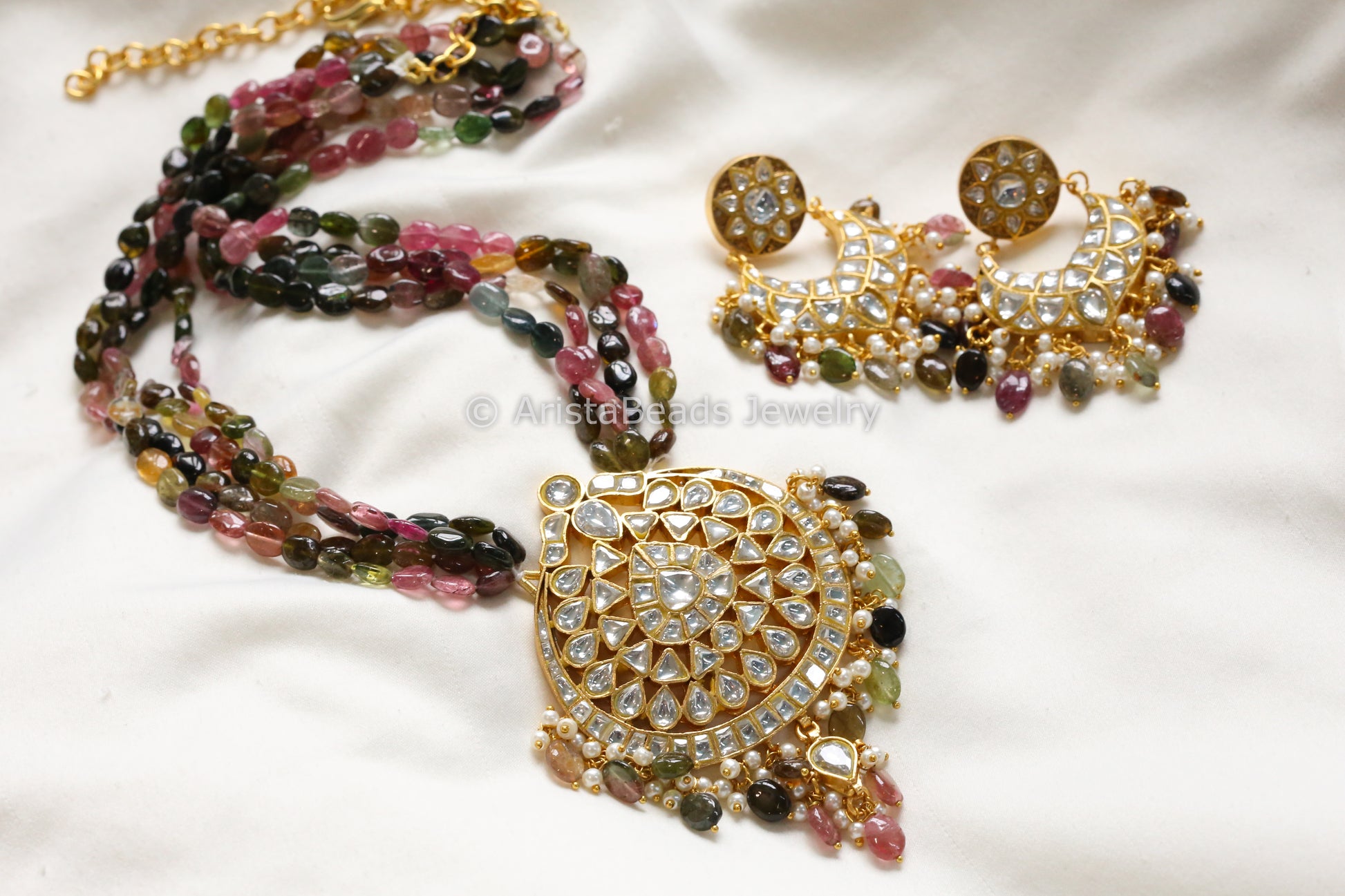 Kundan jadau necklace set with 4 lines of real tourmaline beads and drops