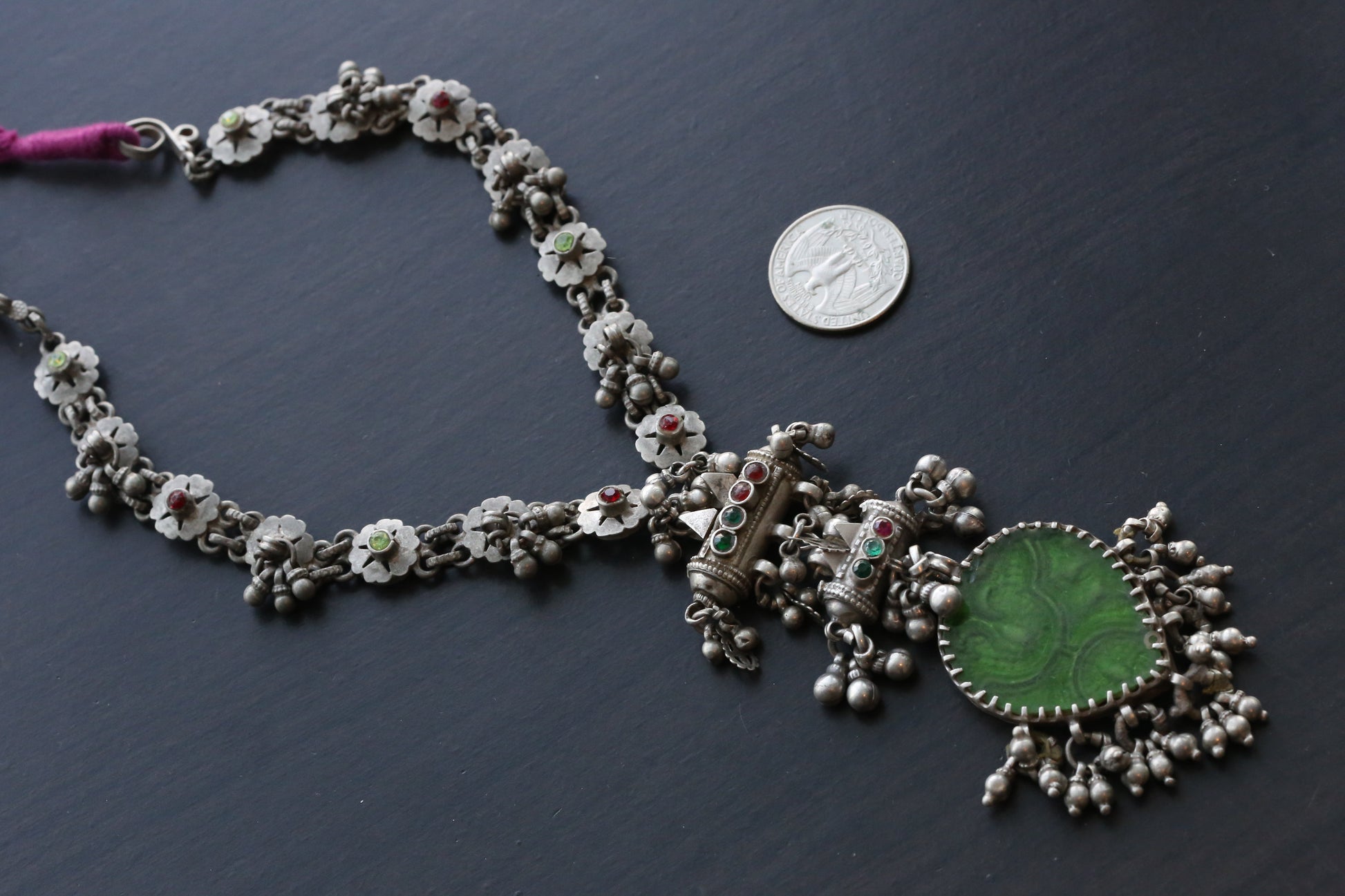 Sterling Silver Dholki Beads Necklace With Real Vintage Glass Silver Pendant