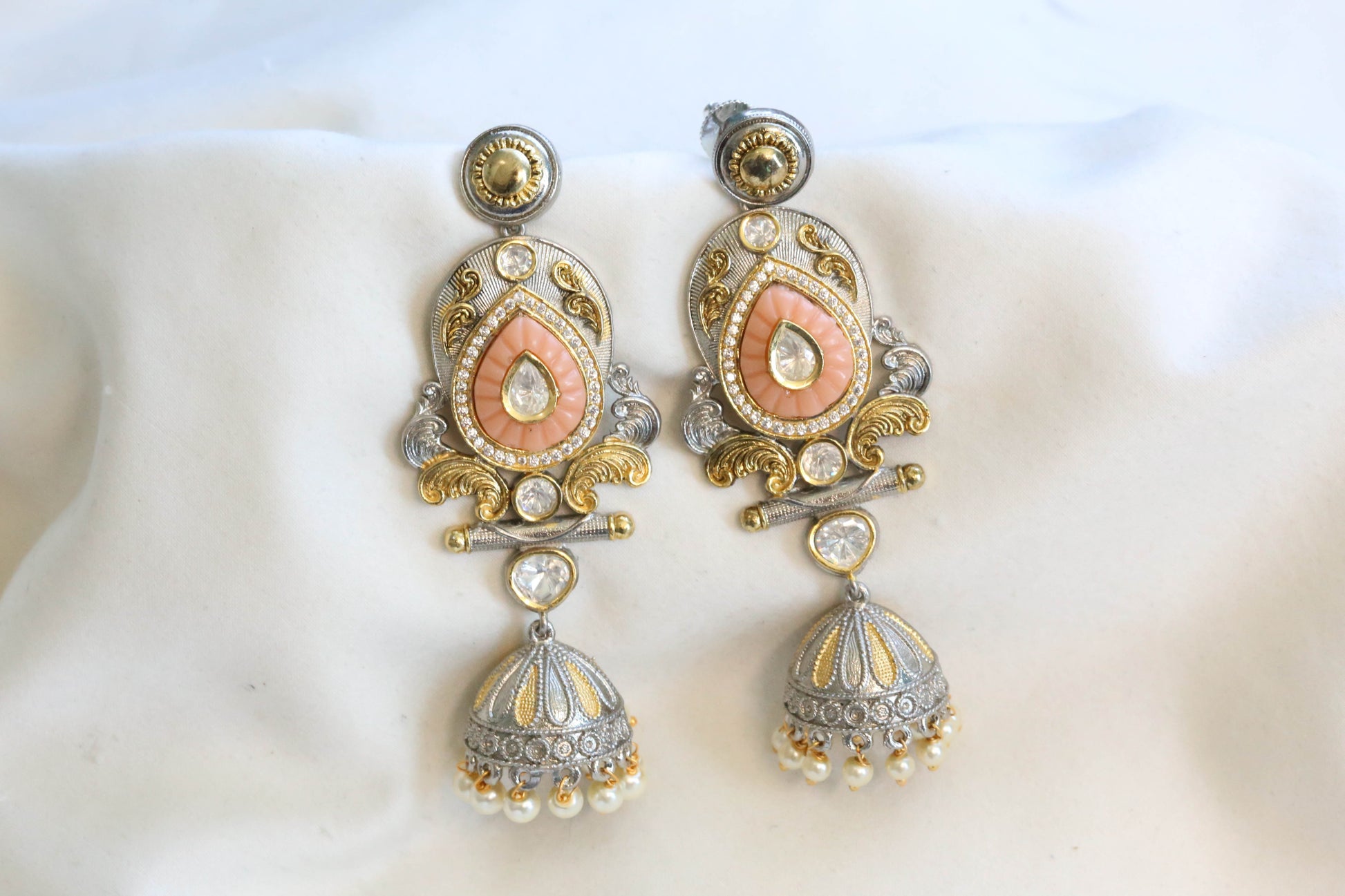 Roshini Dual Tone Carved Stone Jhumka -Coral(101-48)
