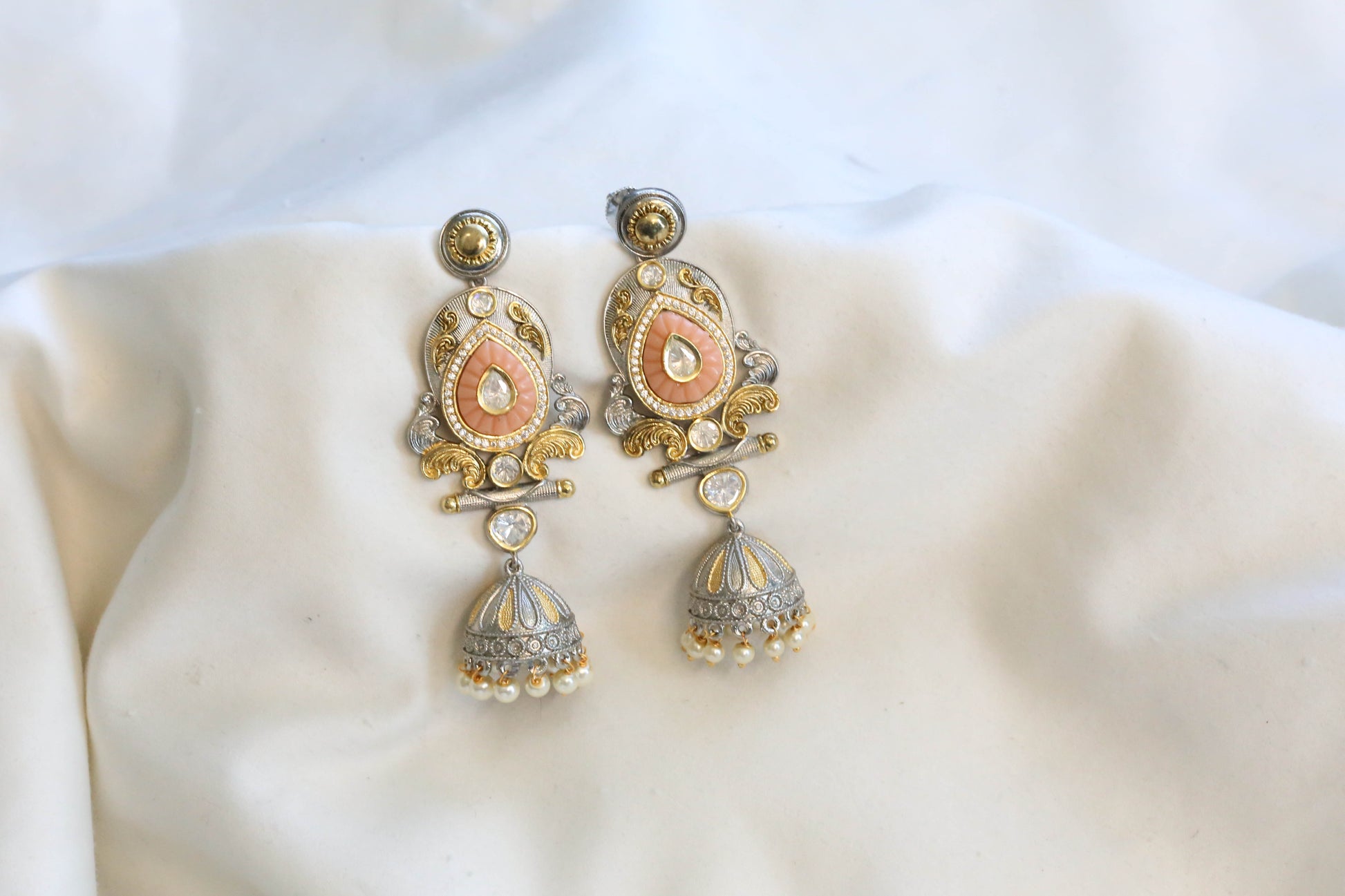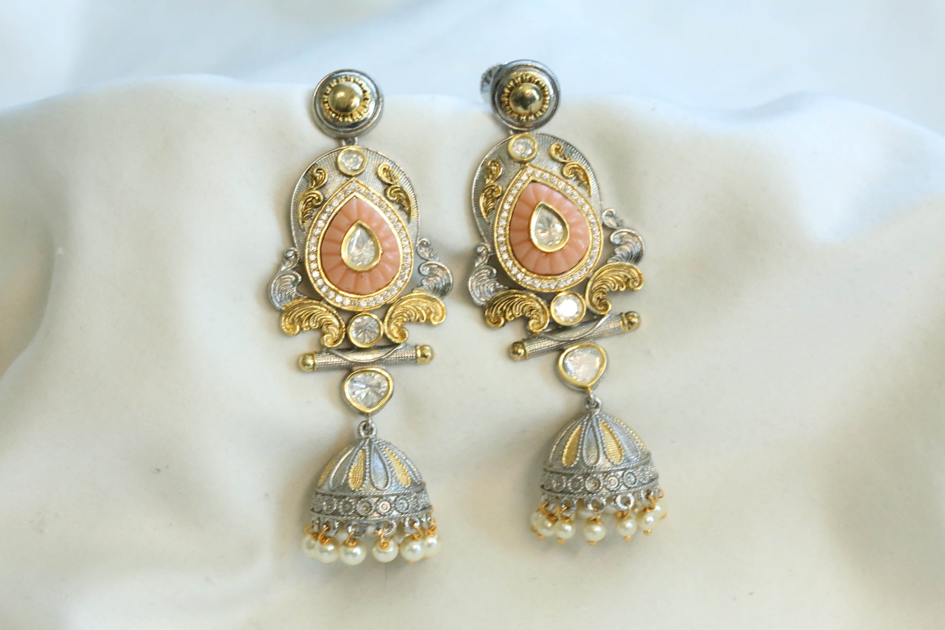 Roshini Dual Tone Carved Stone Jhumka - coral