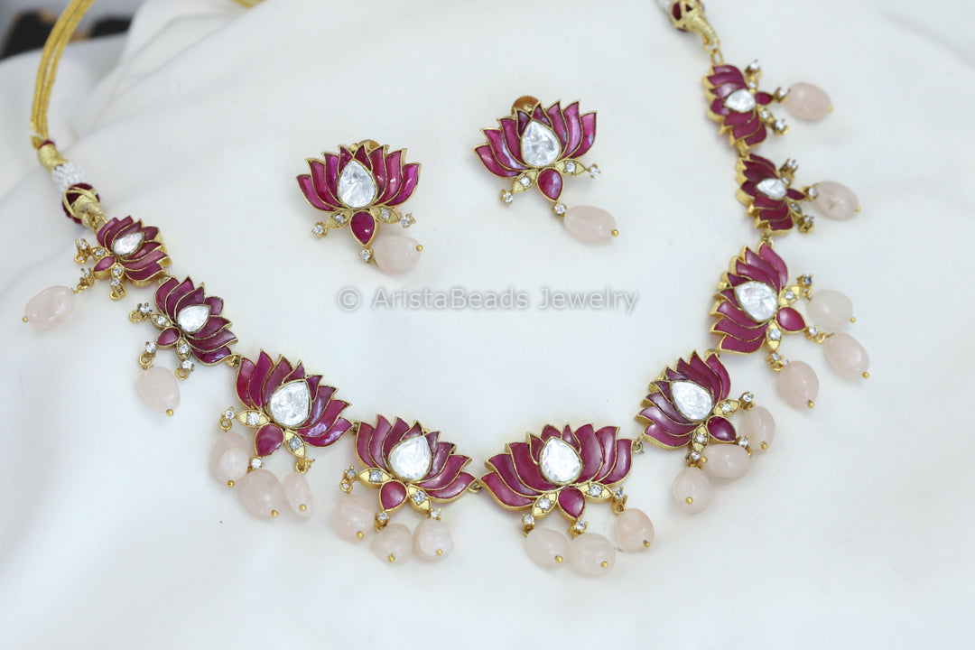 Ruby Jadau & Moissanites Lotus Necklace - Rose Quartz Drops