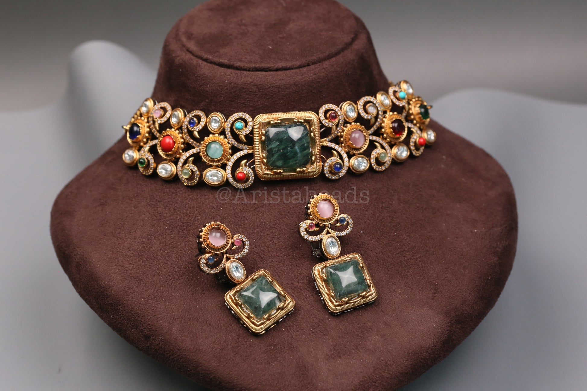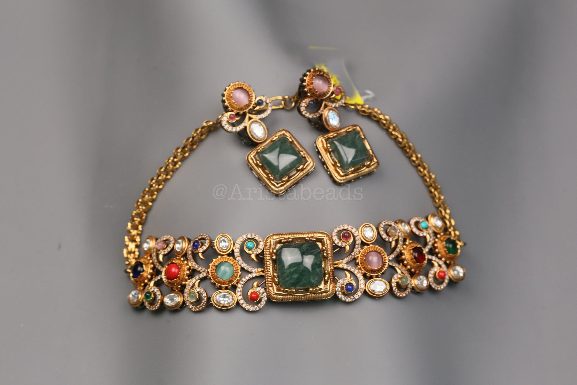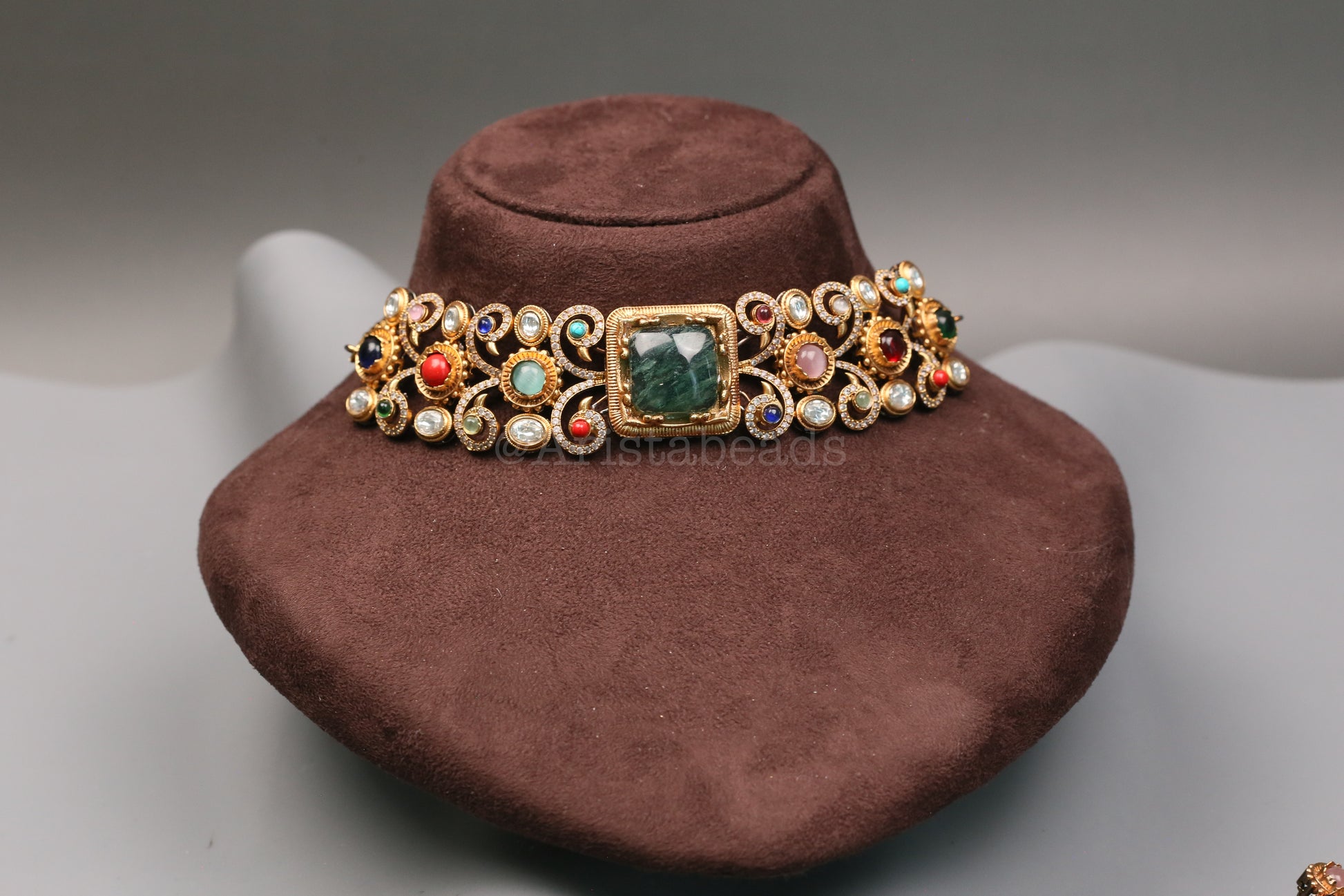 Shama Semiprecious Stones & Polki Choker Set - Green