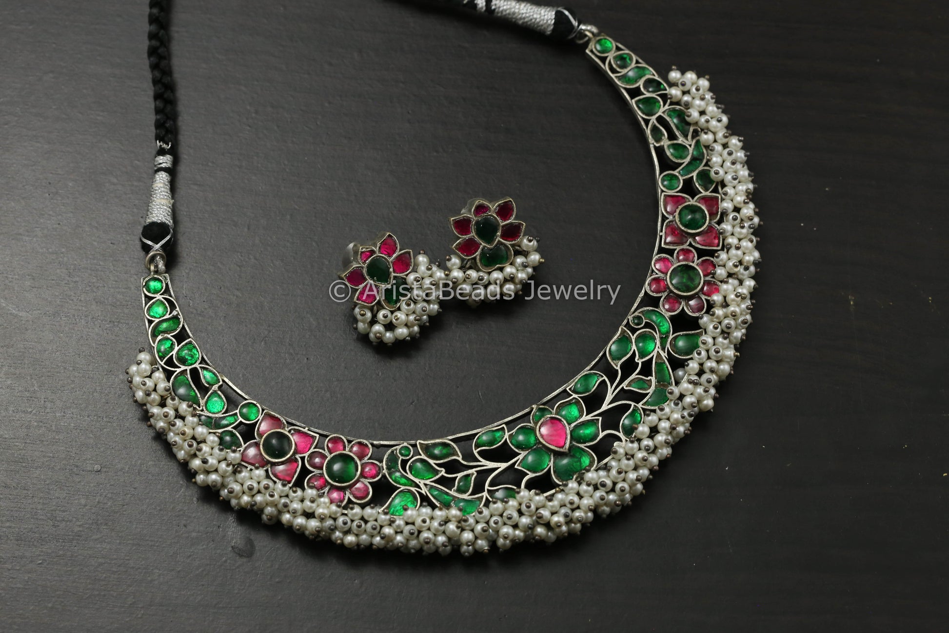 Silver Finish Jadau Hasli Necklace Set - Ruby Green