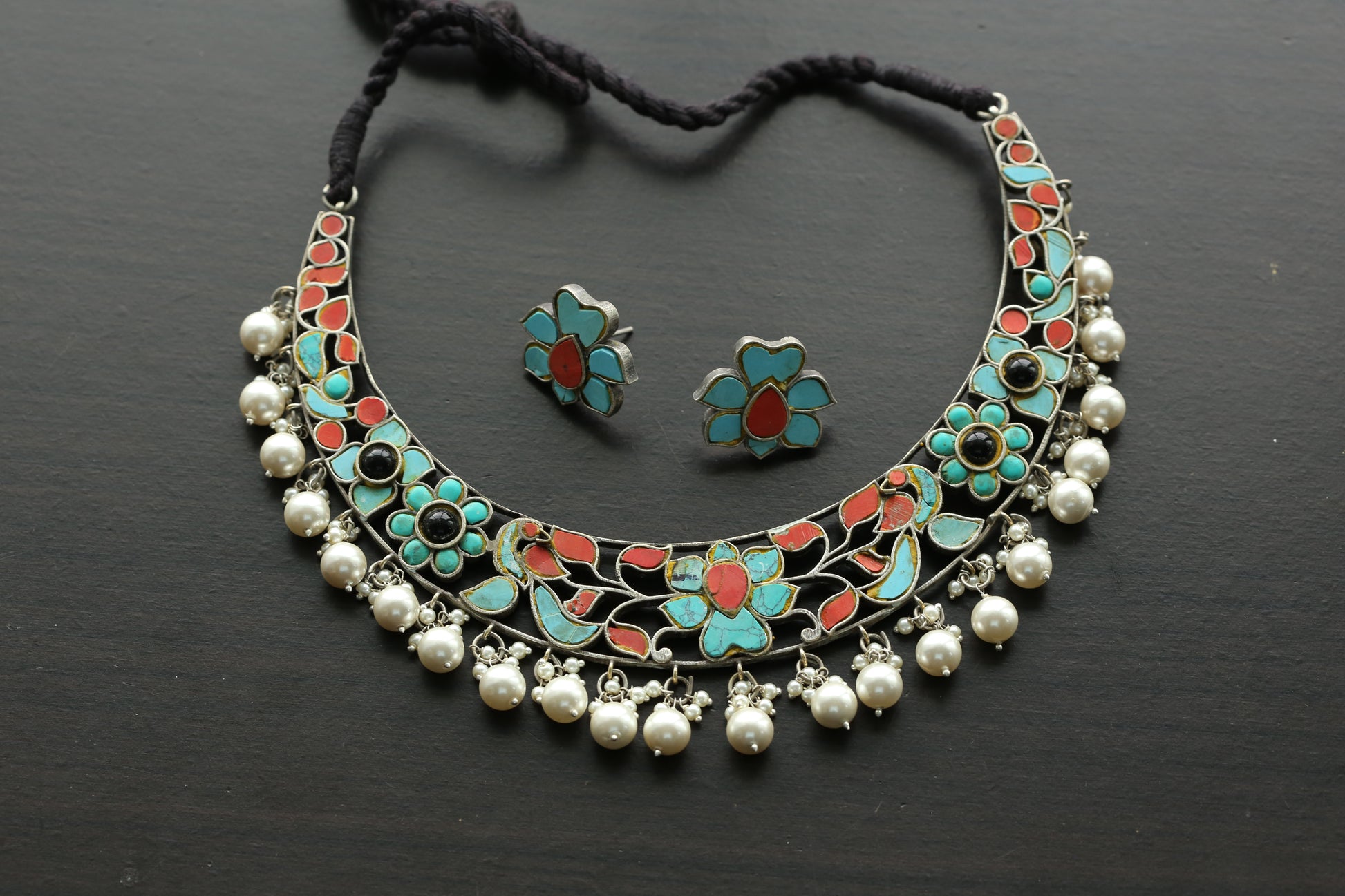 Silver Finish Jadau Kundan Hasli Necklace Set - Coral Turquoise