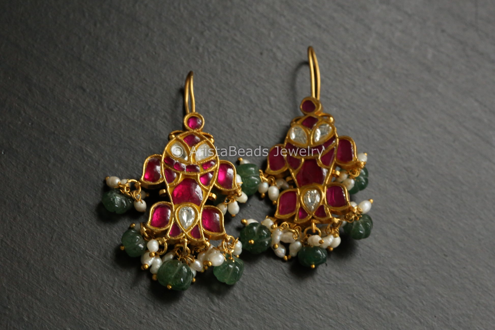 Silver Look Alike Kundan Earrings With Rice Pearls - Green Ruby