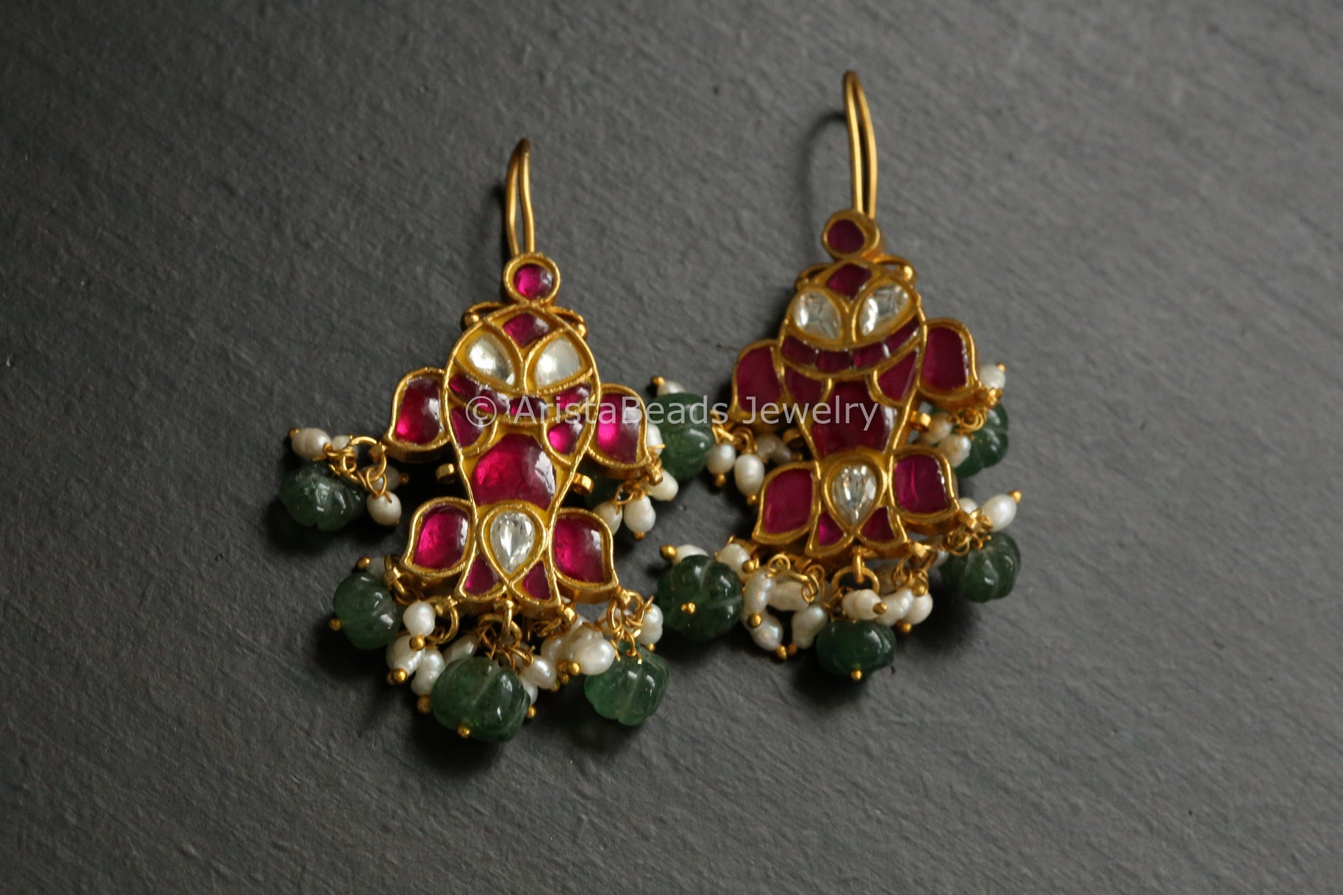 Silver Look Alike Kundan Earrings With Rice Pearls - Ruby