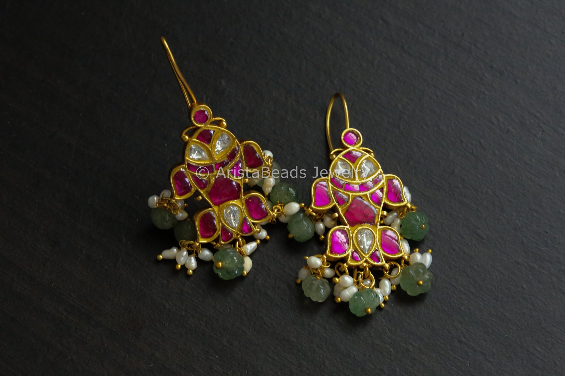 Silver Look Alike Kundan Earrings With Rice Pearls - Ruby