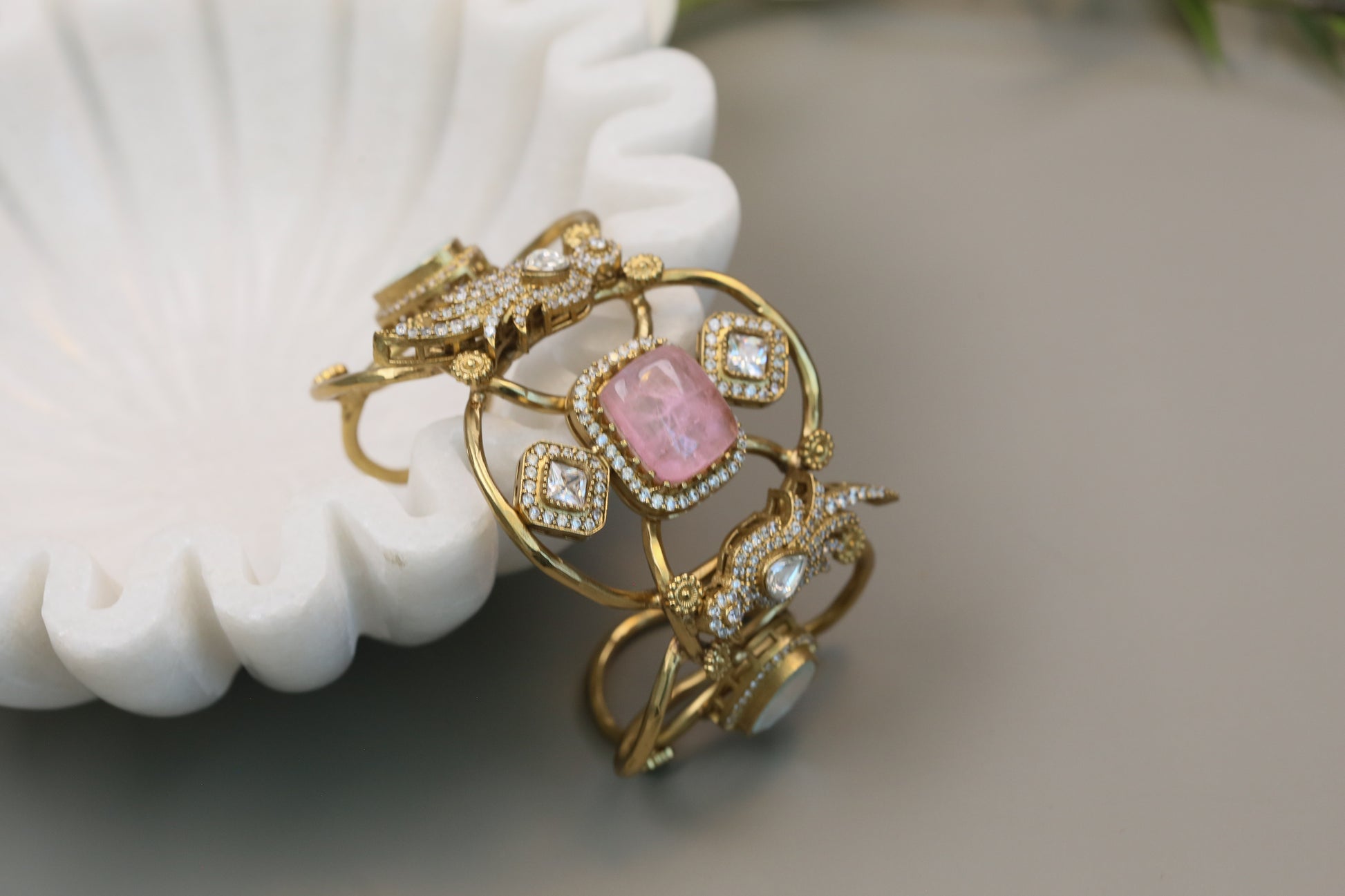 Silver Look Alike Polki, CZ & Doubet Bracelet (Adjustable) -Pink