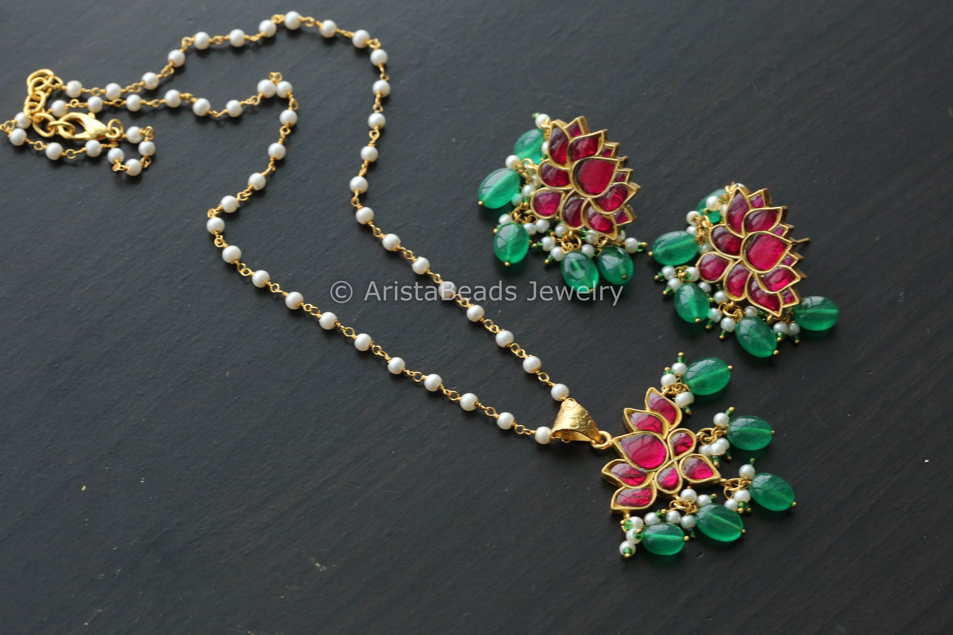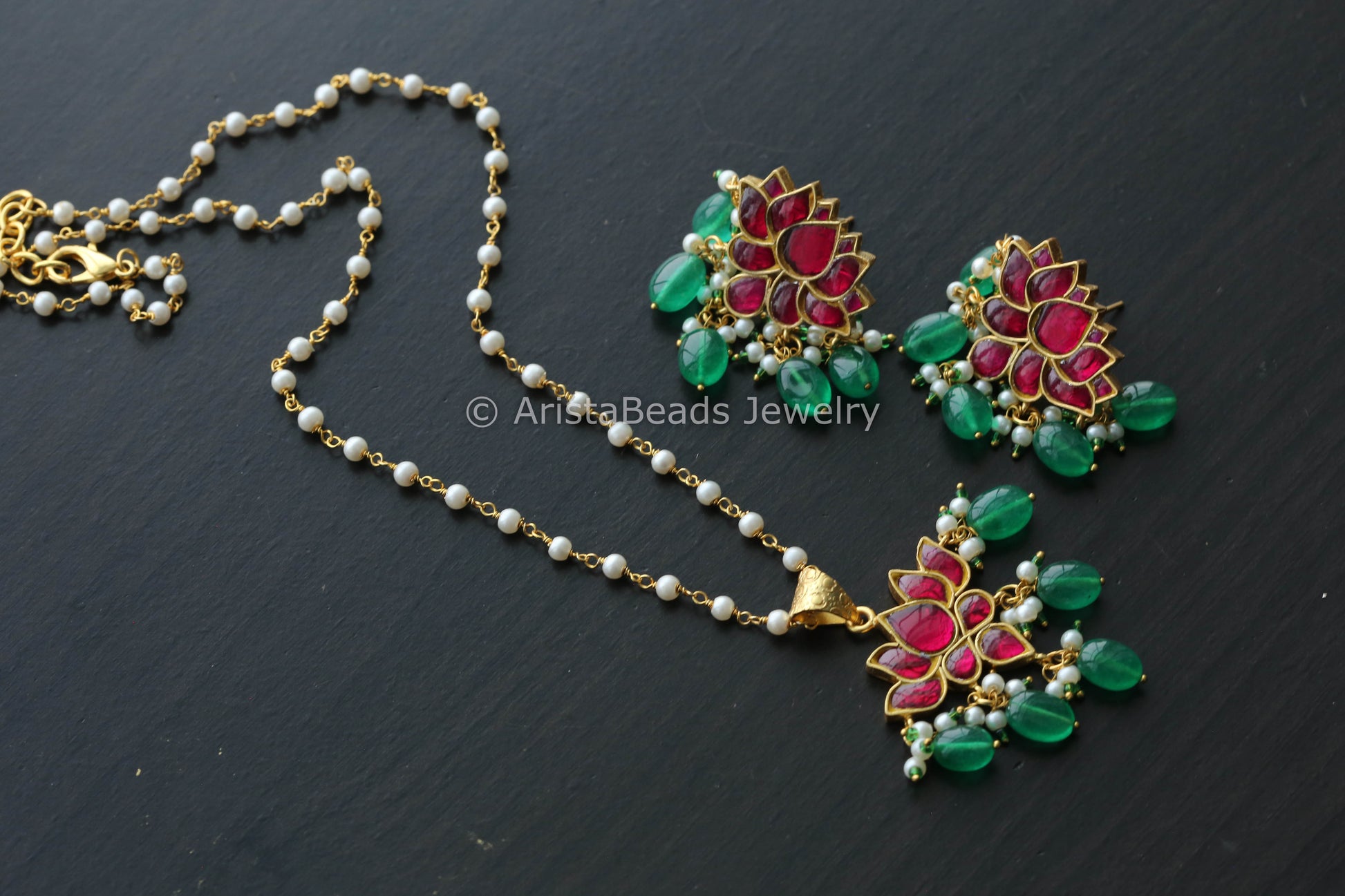 Silver Look Jadau Kundan Lotus Earrings - Ruby
