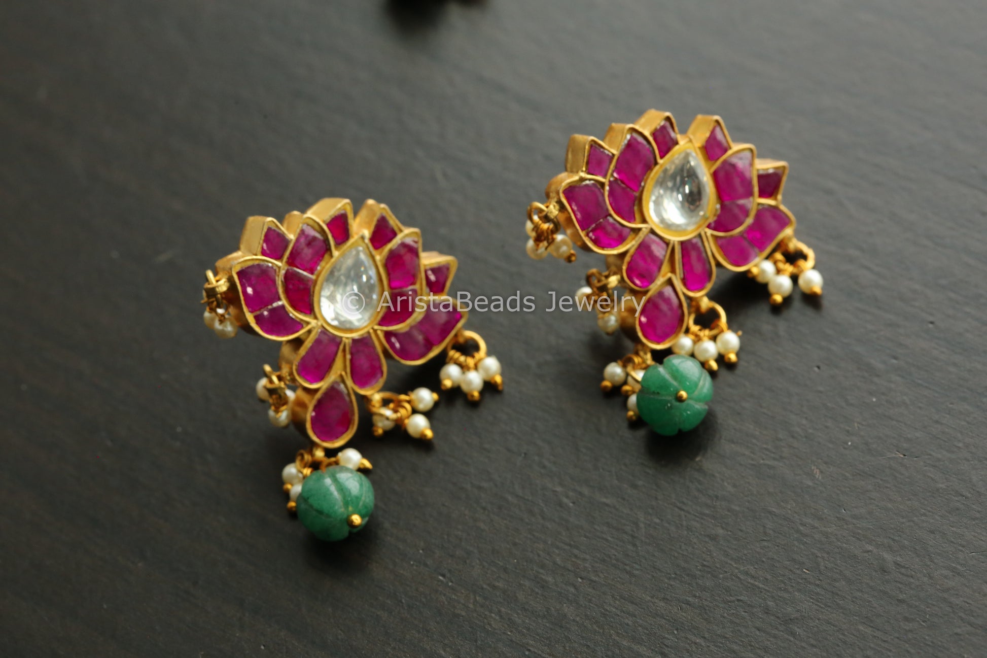 Silver Look Kundan Jadau Lotus Earrings - Ruby Clear