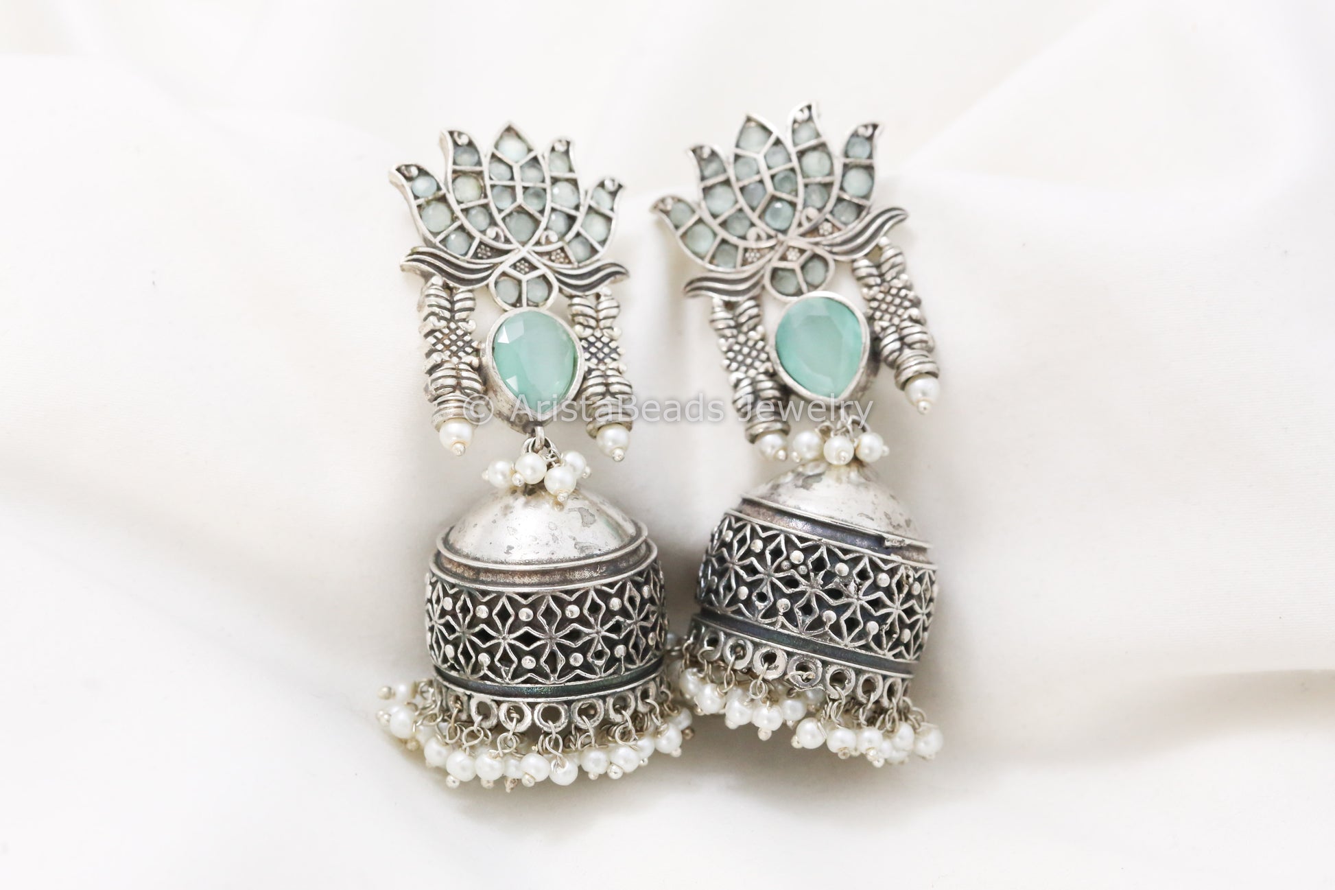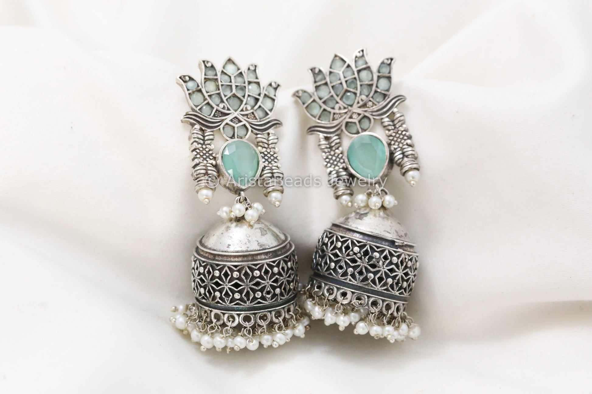 Silver Jadau Look Alike Oxidized Jhumka - Mint