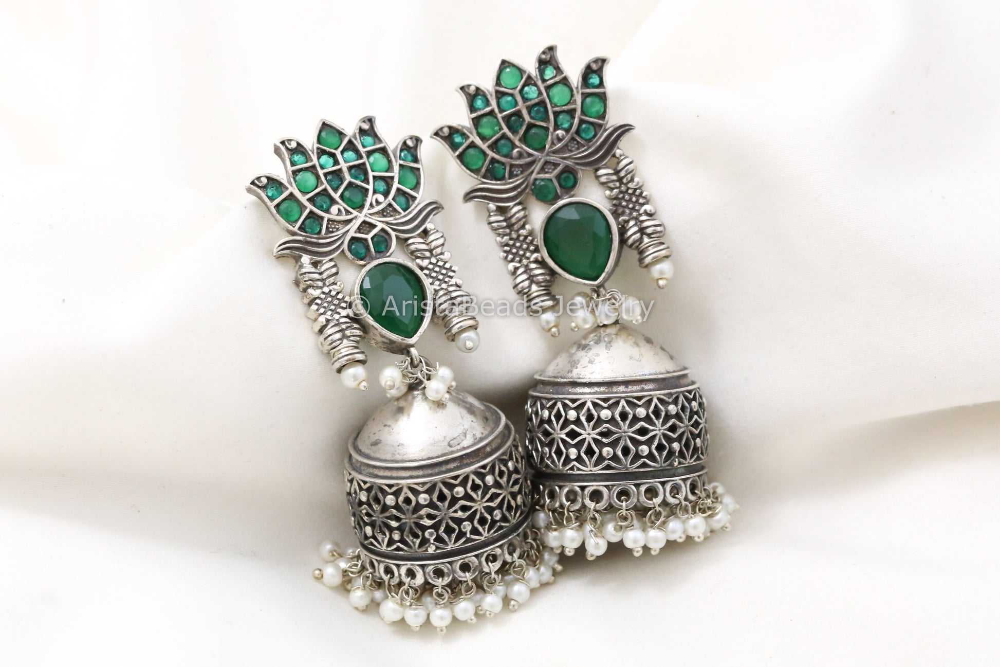 Silver Jadau Look Alike Oxidized Jhumka - Emerald