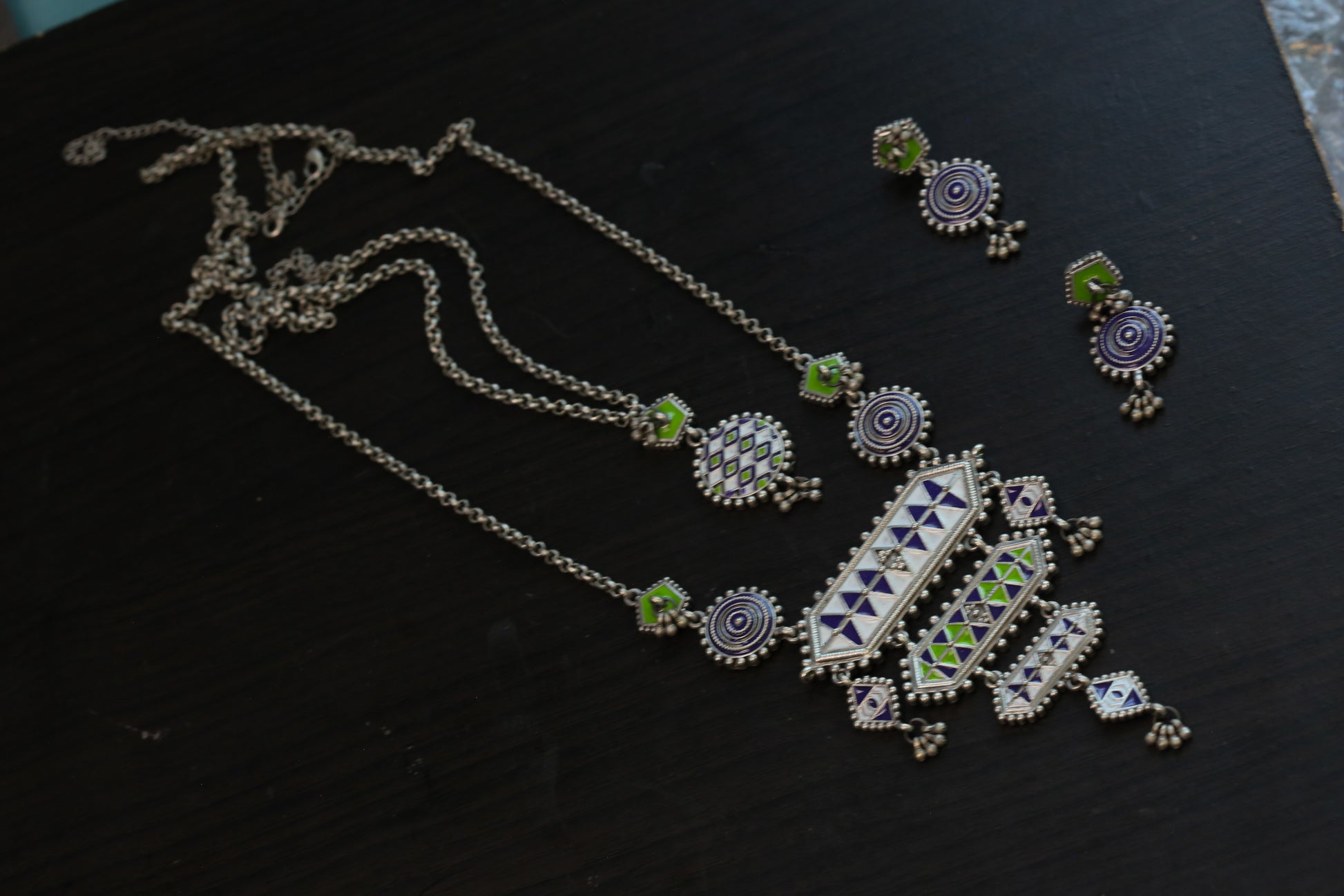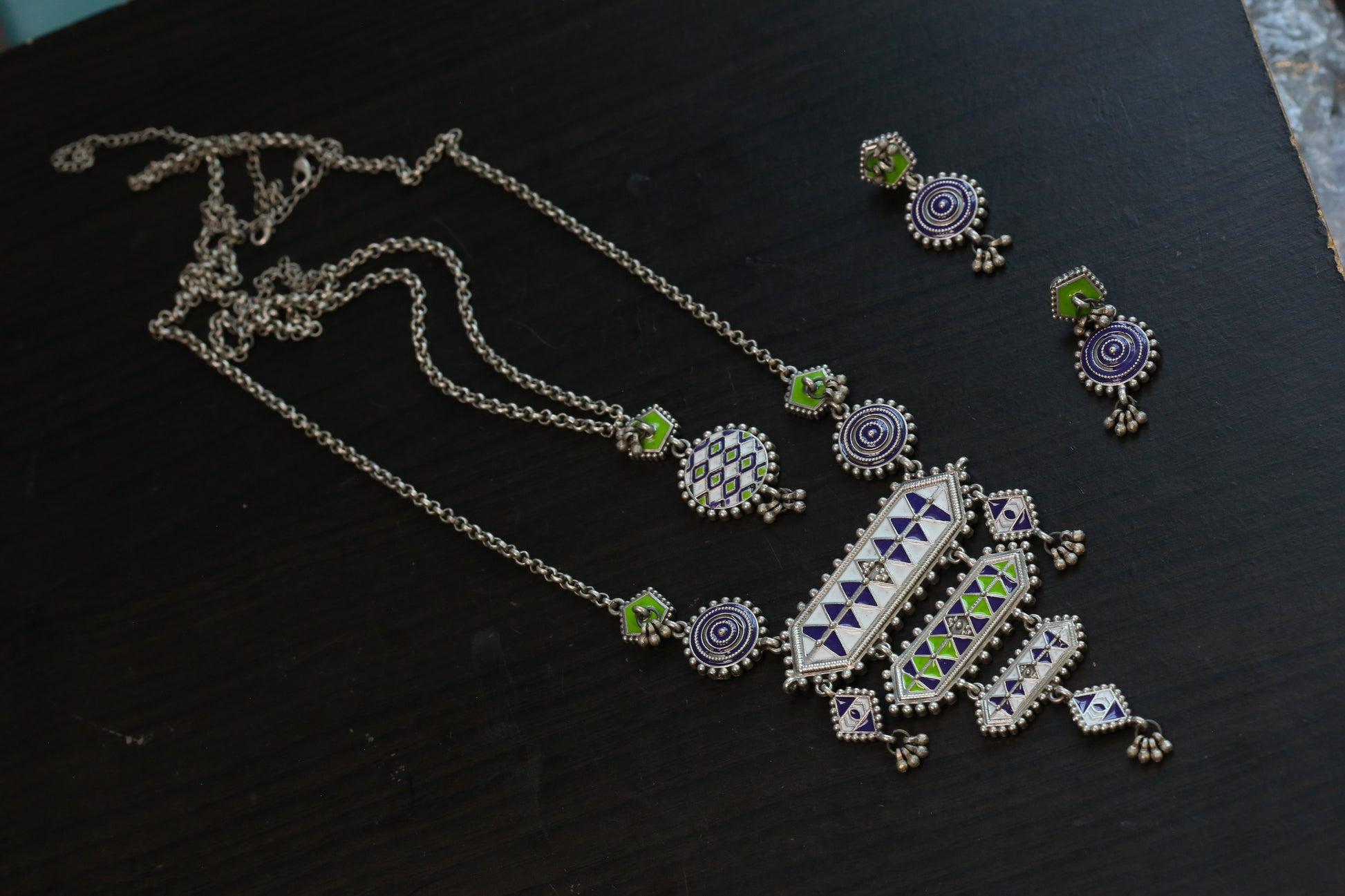 Long Tisha Silver Look Enamel Necklace Set - Style 1