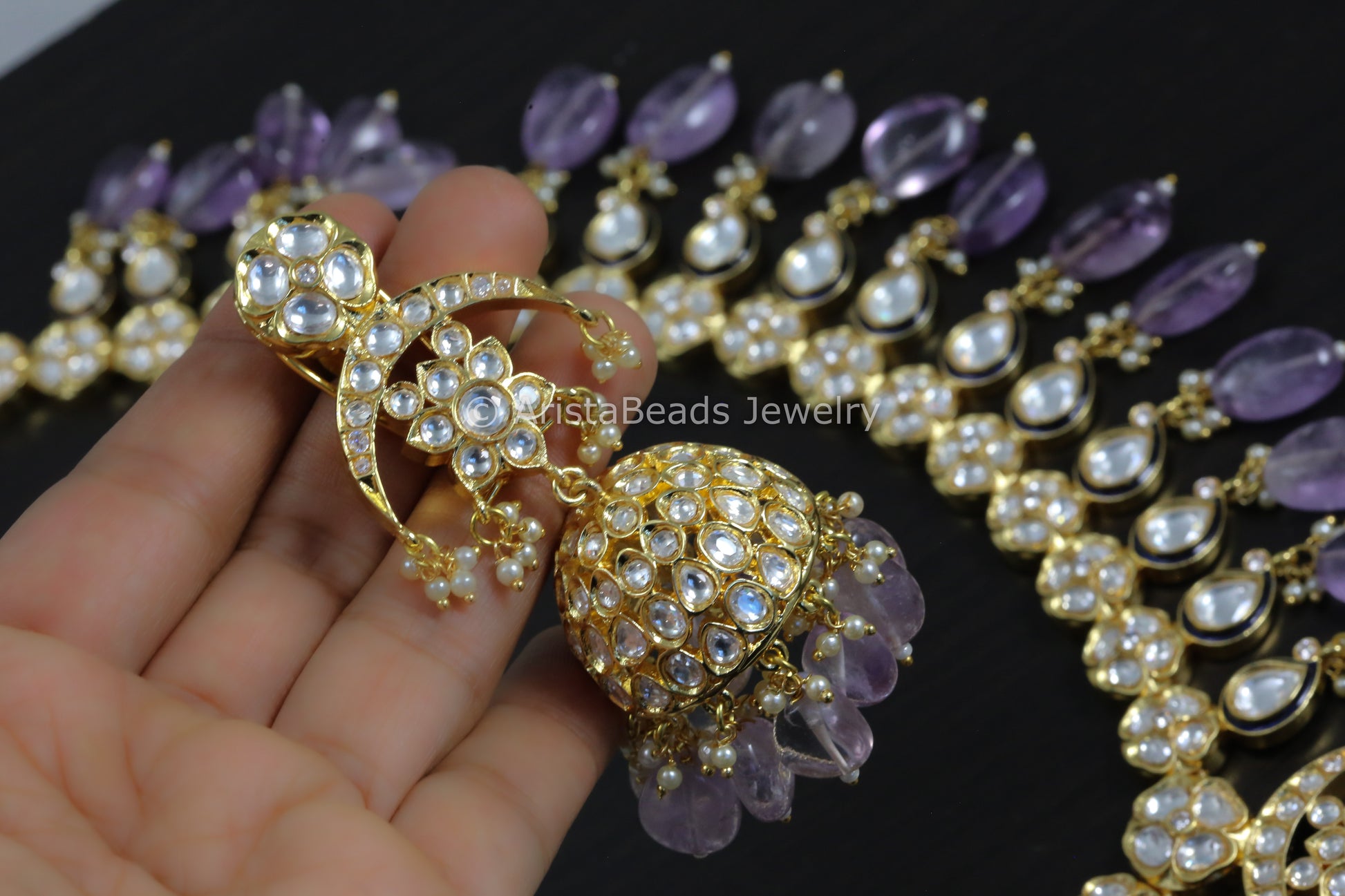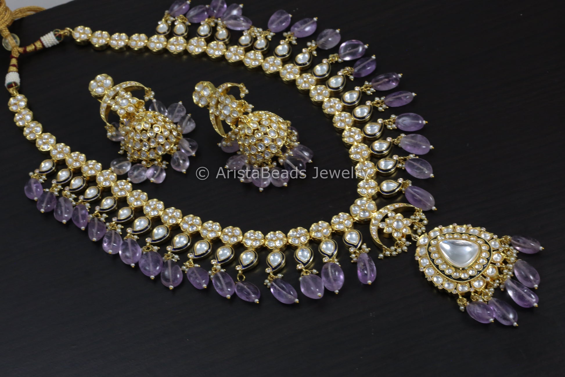 Long Uncut Kundan Necklace Jhumka Set - Amethyst Drops
